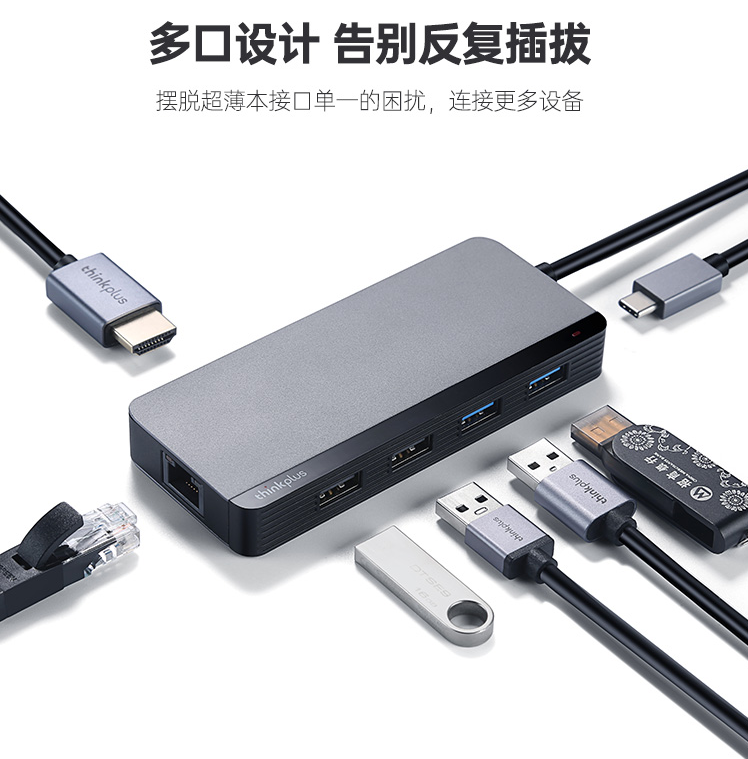 联想Thinkpad Type-C扩展坞 USB分线器 RJ45千兆网口转接头 HDMI转换器 PD快充 笔记本拓展坞 金属LC07-R