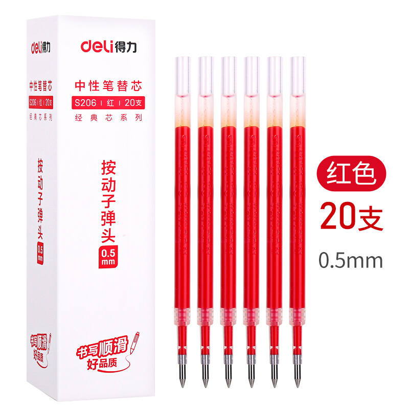 得力S206中性笔替芯0.5mm按动子弹头(红)