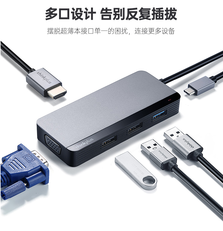 联想Thinkpad Type-C扩展坞 USB分线器 HDMI转VGA转换器 PD快充转接头 笔记本拓展坞 铝合金材质LC05-V