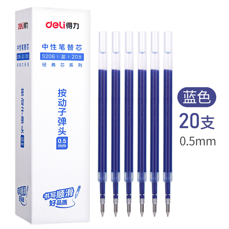 得力S206中性笔替芯0.5mm按动子弹头(蓝)(支)(盒)